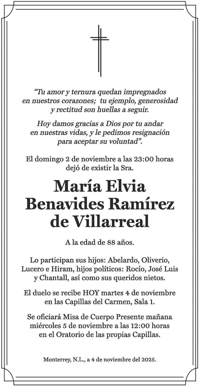 La Misa de Cuerpo Presente se realiza el miércoles 5 de noviembre a las 12:00 horas en el Oratorio de las propias Capillas. Capillas del Carmen