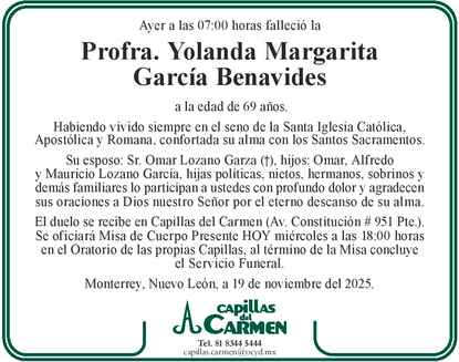 El duelo se recibe el 19 de noviembre a partir de las 10:00 horas en la Sala No. 2 de CAPILLAS DEL CARMEN