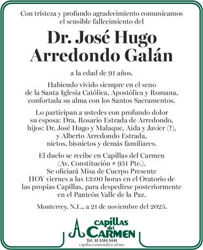 La Misa de Cuerpo Presente se realiza el 21 de noviembre a las 13:00 horas en el Oratorio de las propias Capillas, para despedirse posteriormente en el Panteón Valle de la Paz.