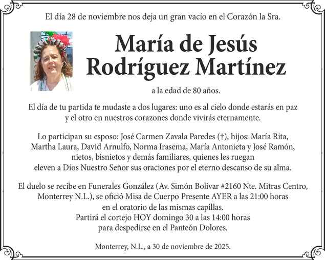El duelo se recibe en Funerales González (Av. Simón Bolivar #2160 Nte. Mitras Centro, Monterrey N.L.), se ofició Misa de Cuerpo Presente AYER a las 21:00 horas en el oratorio de las mismas capillas. Partirá el cortejo HOY domingo 30 a las 14:00 horas para despedirse en el Panteón Dolores.